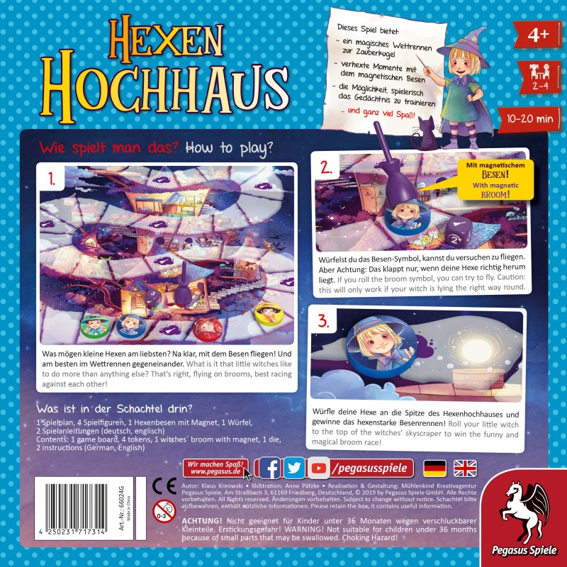 Hexenhochhaus îi trimite pe jucători într-o cursă plină de tensiune. Jucătorii se deplasează în funcție de cât arată zarul, avansând câțiva pași sau uneori pot folosi o mătură magică pentru a călători, dar numai dacă sunt pregătiți.