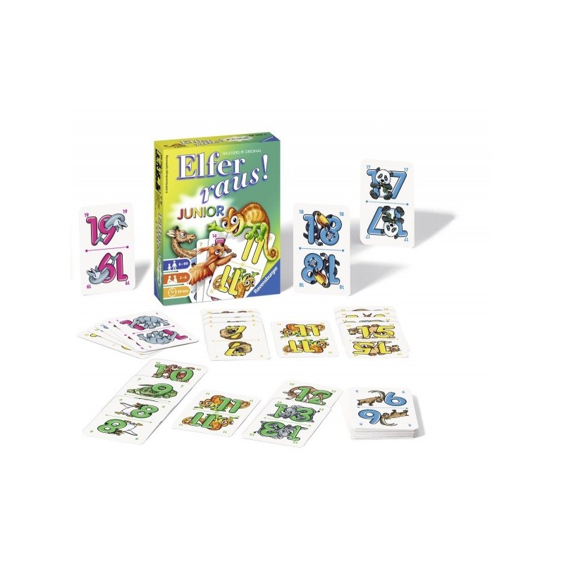 Elfer raus! Junior este ediția pentru copii a popularului joc clasic Elfer raus! Fiecare jucător încearcă să scape de cele cinci cărți din mână cât mai repede posibil. Toate cărțile sunt ilustrate cu animale amuzante, cum ar fi cangurul adormit, maimuța obraznică sau crocodilul amuzant! Dacă nu puteți pune jos corect, trebuie să trageți o carte. Cine a aruncat mai întâi toate cărțile este câștigătorul! Cu noua regulă de intrare, popularul joc de cărți va fi, de asemenea, o experiență excelentă pentru copiii mai mici. Și apropo, copiii exersează într-un mod jucăuș numerele de la 1 la 20. Dacă devi un profesionist cu această variantă de joc poți trece la una dintre celelalte opt reguli ale jocului.